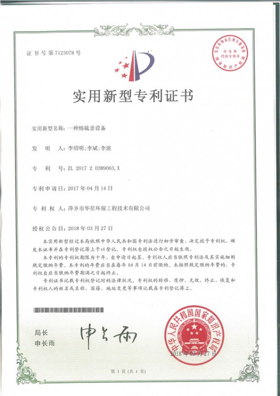 • 一種濃硫酸自動脫水塔--實用新型專利證書